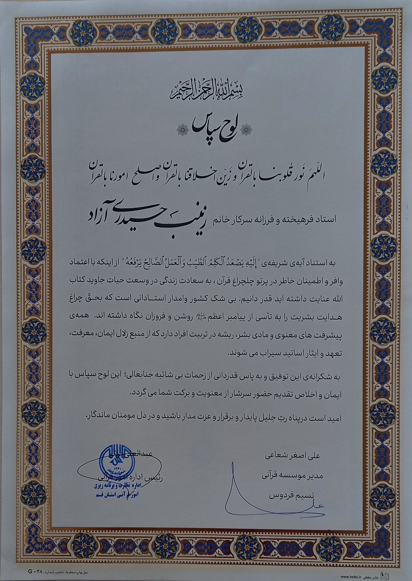 در راستای آموزش قرآن کریم؛آموزش بخش های تفسیری و کاربردی قرآن مربوط به مسائل روز و پیشگیری و تبیین فساد های اخلاقی از جمله بی حجابی،اخلاق سوء،بی احترامی و غیره