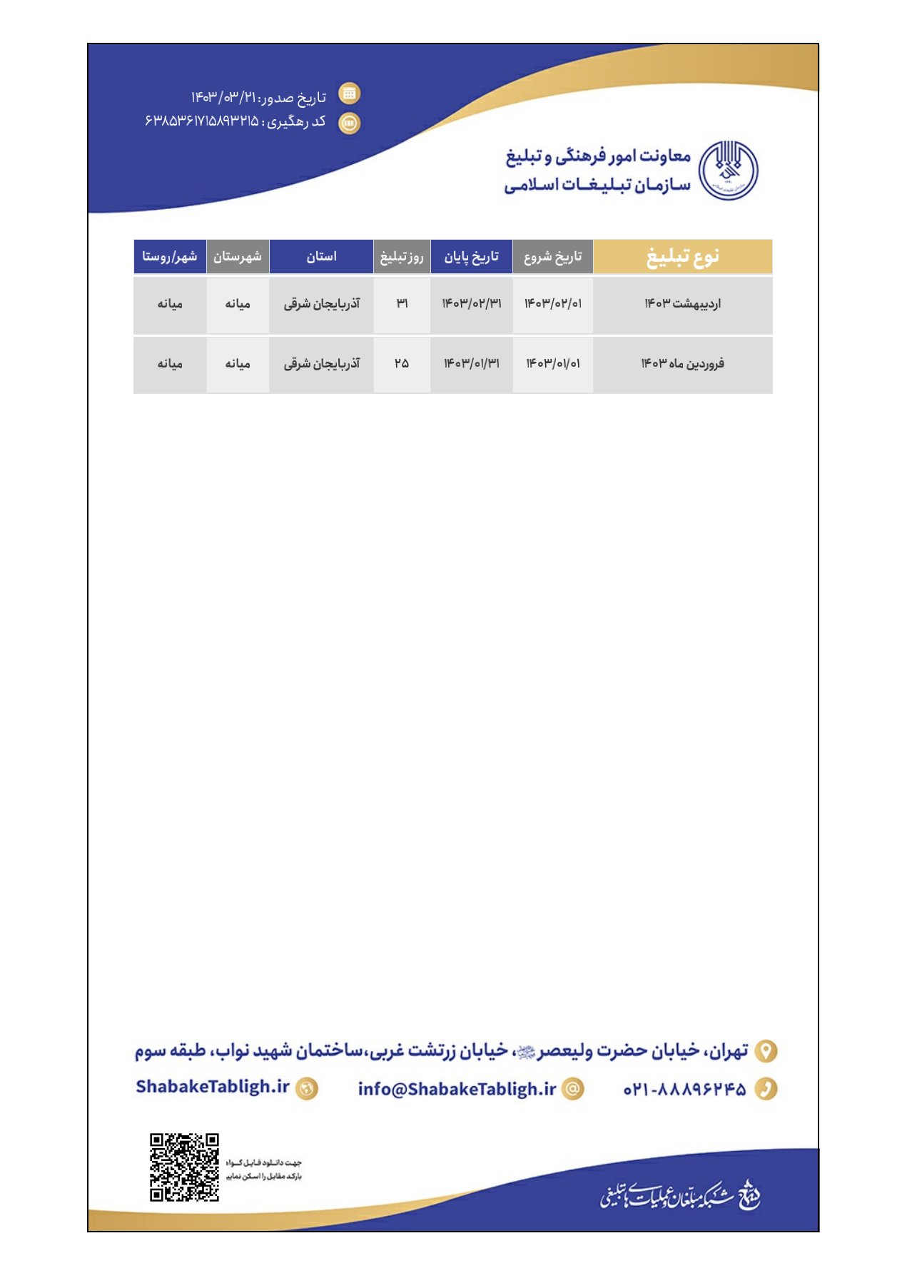 فرآیند و روش اجرا: فعالیت اصلی شامل «سخنرانی» و «تبلیغ چهرهبهچهره» در موضوعاتی چون جوانی جمعیت، فرزندآوری، پیشگیری از طلاق، تغذیه سالم، عفاف و حجاب، پذیرش حوزه، و مشارکت در انتخابات است. روش اجرای فعالیت به صورت دعوت از سوی پایگاهها و حسینیهها برای سخنرانی، مشاوره، پاسخ به سؤالات شرعی و ارتباط چهرهبهچهره با مخاطبان بوده است.