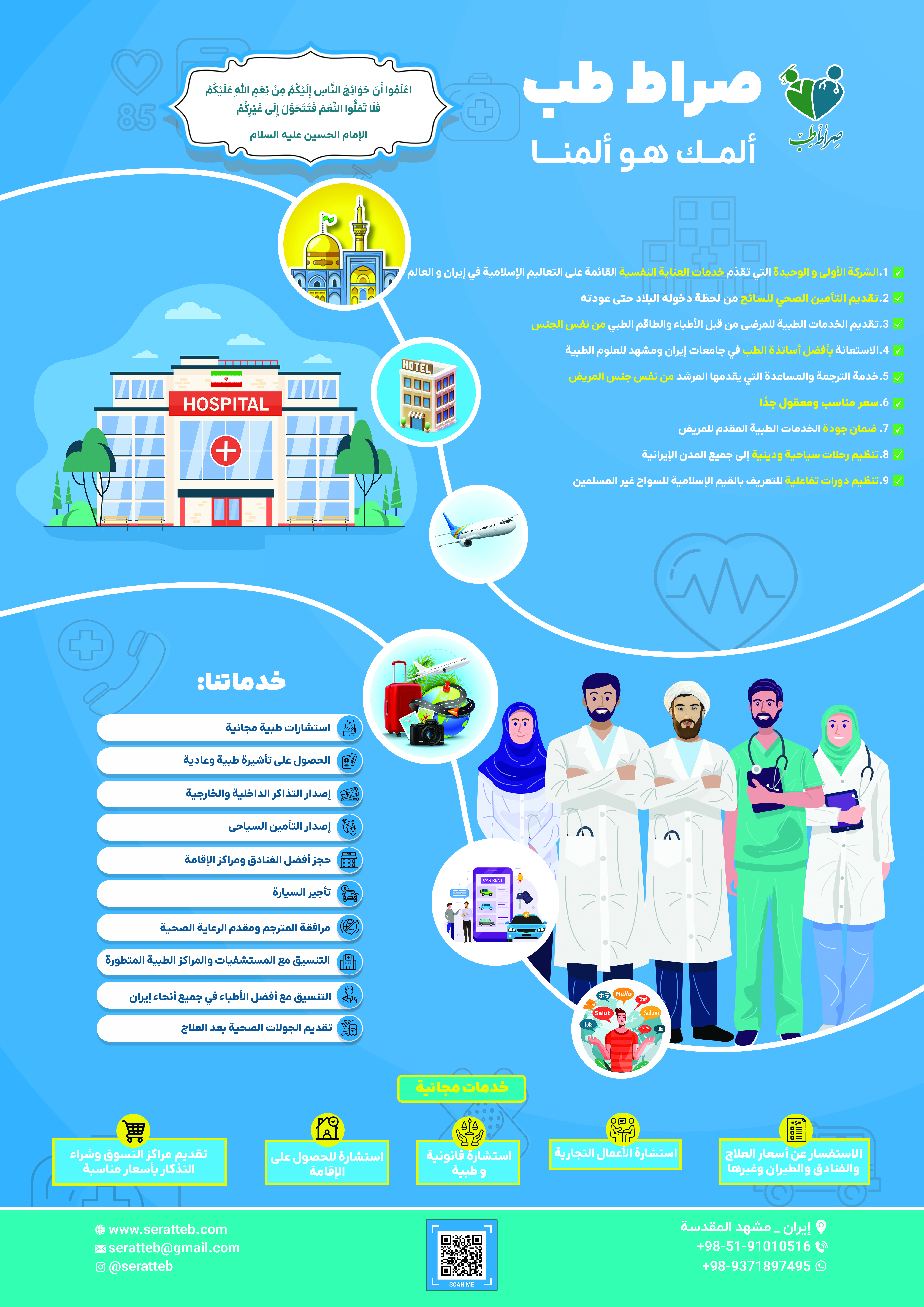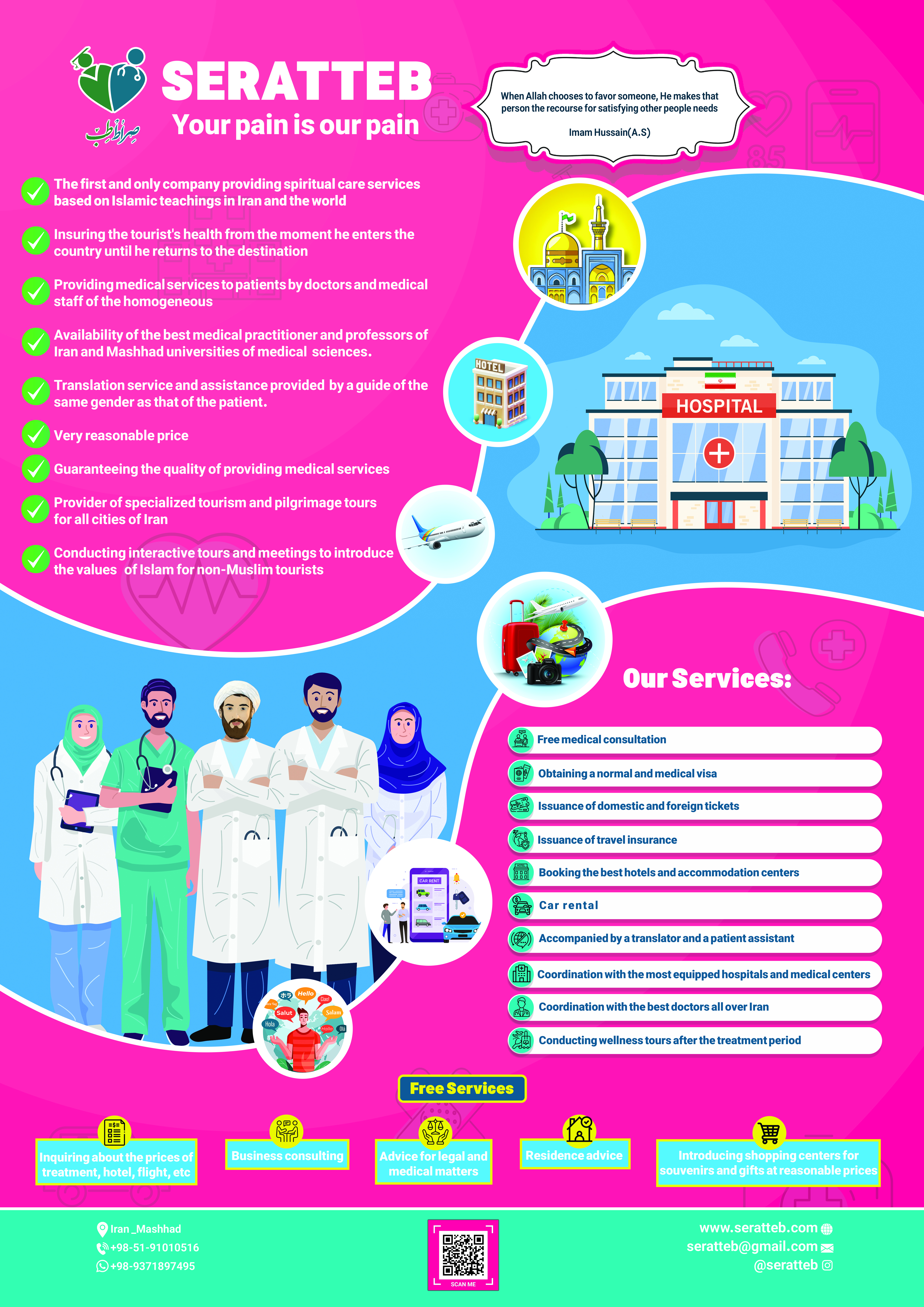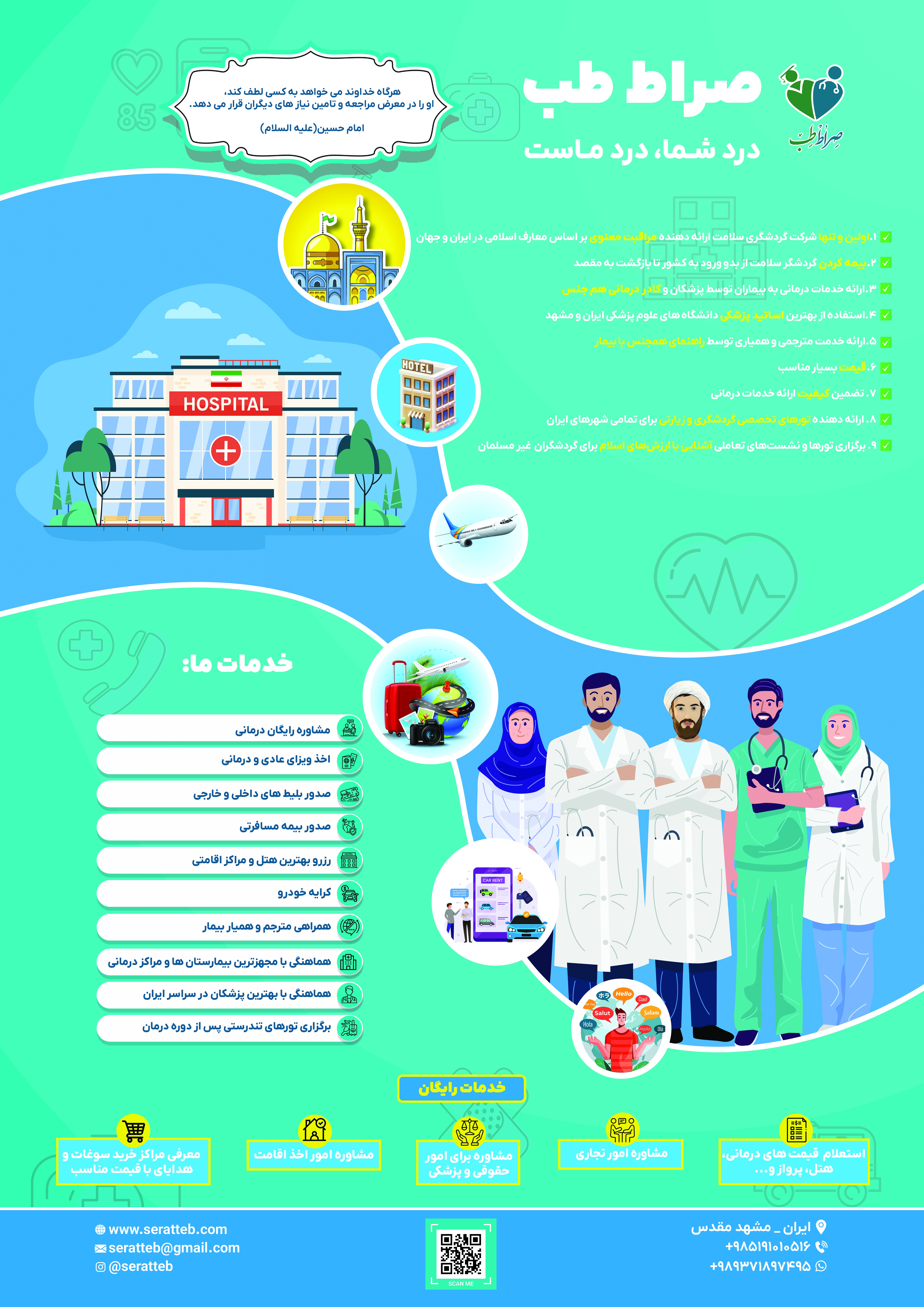 این فعالیت ناظر به چه نیاز مخاطبان است (مساله شناسی و ریشه یابی)؟ فعالیت شما چگونه این نیاز را برطرف میکند؟ نتایج و دستاوردهای شما چیست؟مسألهشناسی و ریشهیابی: نیاز اصلی مخاطبین، دریافت خدمات درمانی با کیفیت و همراه با احترام به باورهای مذهبی و فرهنگیشان است. همزمان، نیاز به آرامش روانی، امیدبخشی و پاسخ به شبهات و بحرانهای معنوی ناشی از بیماری، مهمترین بخش نادیده گرفته شده در خدمات گردشگری سلامت است.
