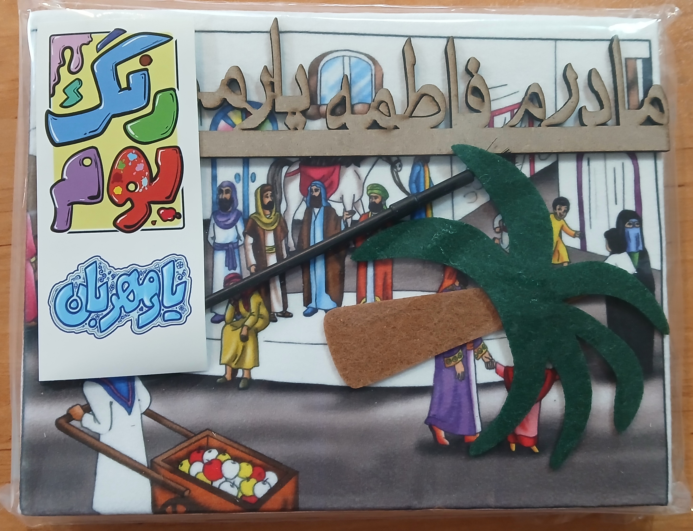 در بومرنگ تصویر هفتم داستان که اوج قصه است بر روی پارچه چاپ شده است و قسمت هایی از آن سفید (بی رنگ) شده است کودک با قلم مویی که در بسته است با رنگ گواش شروع به رنگ آمیزی می کند سپس چوب لیزر شده شعار محصول (مادرم فاطمه یار مهربان) را رنگ می کند و بر روی بوم در قسمت بالا می چسباند سپس قطعات نمدی لیزر شده نخل را بر روی مقوایی می چسباند تا به بوم خود بُعد بدهد . به همراه این بوم یک دفترچه رنگ آمیزی می باشد که بقیه تصاویر داستان برای رنگ آمیزی و متن داستان قرار گرفته است .