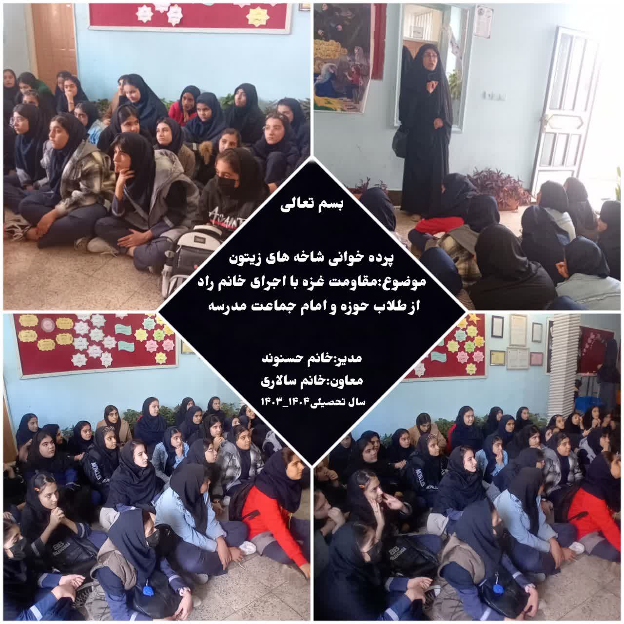 این طرح با عنوان «پردهخوانی مقاومت و گفتمان و جلسات قرآنی» در قالب انجمن پردهخوانی اجرا میشود. فعالیتها شامل پردهخوانی با موضوعات متنوعی چون زندگی اهلبیت علیهمالسلام، بهویژه حضرت زهرا سلاماللهعلیها، و همچنین موضوعات روز نظیر مقاومت و مسائل مربوط به غزه است. جرقه اولیه این فعالیت، از طراحی پردهها توسط یک بانوی فعال فرهنگی با همکاری طلاب شکل گرفت و ایدهپردازی آن نیز توسط ایشان انجام شده است.